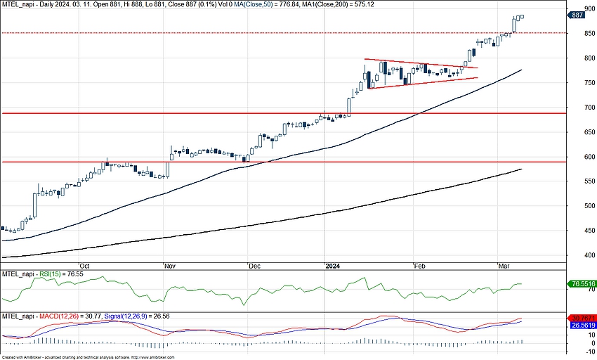Ugyan nagy erőt ma délelőtt nem mutat a Telekom, így kisebb visszaesés figyelhető meg, bár a hosszabb távú trend változatlanul stabil emelkedést jelez, így egyre inkább közelíti a 900 forintos szinteket a részvény. Már így is 2008 elején látott szinteken jár újból az árfolyam, kiemelt ellenállást a lélektanilag is fontos 1000 forintos szint képezhet. Támaszként elsősorban az 50 napos mozgóátlag azonosítható, kisebb korrekció során ez nyújthatna támogatást az árfolyam számára. Az indikátorok változatlanul magas szinteken tartózkodnak, de a pozitív momentum, illetve a kedvező kilátások is kellő lendületet biztosítanak egyelőre a részvénynek.