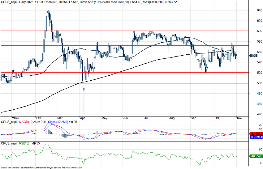Továbbra sem tud lendületbe kerülni az Opus részvénye, így az idei teljesítmény alapján lemaradónak számít a BUX indexhez képest. Technikailag az árfolyam előtt több erős ellenállási szint is húzódik, a mozgóátlagok mellett az 570 forintos szintnél is akadályba ütközött az árfolyam, valamint az indikátorok sem mutatnak egyértelmű jelzést. A cégcsoport folytatja részvény-visszavásárlási programját, a harmadik negyedéves eredményekre viszont még várni kell, amelyek majd december 15-én kerülnek publikálásra.