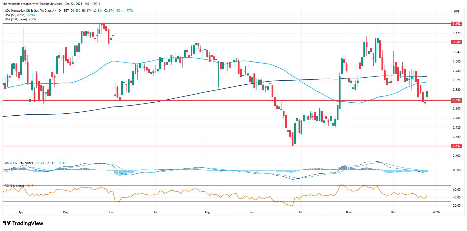 Alulteljesítő volt az elmúlt hetek során a Mol részvénye a magyar piacon, bár globális szinten is gyengébb teljesítményt produkáltak az energiaszektor szereplői, hiszen az energiaárak mérséklődése a piaci hangulatot is gyengítette. Így a régiós versenytársak is visszaesést produkáltak a múlt hét során, míg ma délelőtt új lendületet próbálna venni a Mol. A 2800 forint körüli szintek kellő védelmet nyújtottak az elmúlt időben, így idővel akár újra megpróbálkozhatna a mozgóátlagok áttörésével az olajtársaság. Nagymértékű emelkedést egyébként nem produkált idén az árfolyam, bár osztalékkal együtt így is közel 15 százalékos teljesítmény mutatkozik, amely szektor szinten nem rossz teljesítmény.
