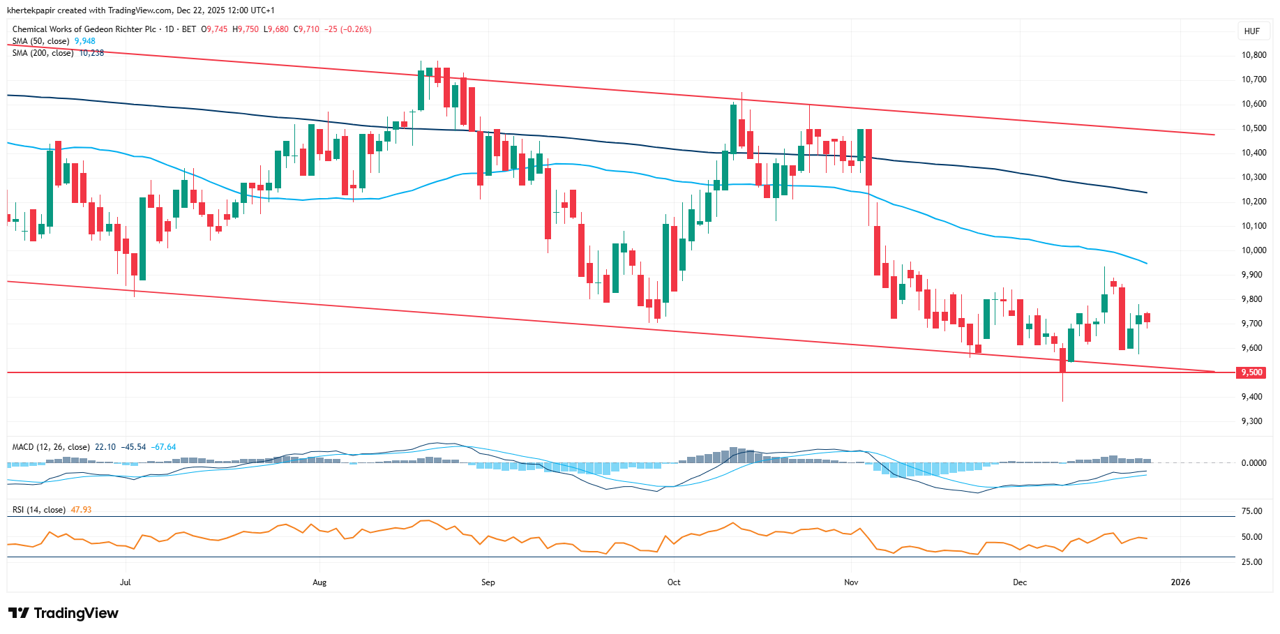 Vegyes mozgásokat mutatott be az előző héten a Richter, a hét első felét még alapvetően jól kezdte, szerdán viszont gyengébben szerepelt a papír, és 9600 forint környékére került vissza. Innen a csütörtök és a péntek megint erősebben alakult, de láthatóan nincs határozott irány most a grafikonon, a 9600-9800 forintos szintek környékén mozog az árfolyam. Látható, hogy a 9600 forintos szintek azért erős támaszt jelentenek, miközben a csökkenő trendcsatorna alsó részénél található a papír.