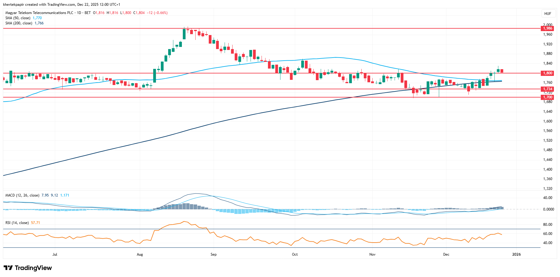 Kisebb lendületet vett az elmúlt hét során a Telekom, így sikeresen törte át az 1800 forintos szinteket a részvény, így érdemes lesz figyelni, hogy tartósan képes lesz-e a szint felett maradni a Telekom. Fontosabb ellenállást a 2000 forint körüli szintek képezhetnek, az idei évi csúcsok is e körül rajzolódnak ki. A Bloomberg elemzői célárainak konszenzusa jelenleg 1967 forint körül található, ez alapján is lehet még tér a Telekom előtt, amely egyébként az idei évben is az egyik legerősebb BUX komponensnek számít, 50 százalék feletti teljes hozamot felmutatva ezzel idén.
