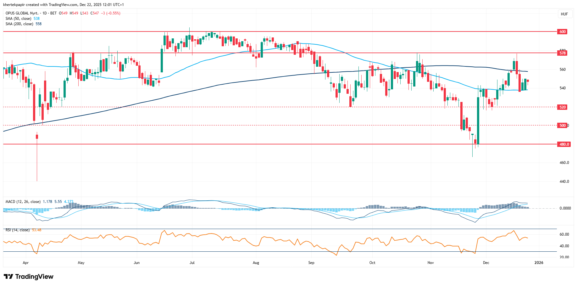 A múlt hét hétfőn reggel közzétett gyorsjelentést követően nem tudott tartós lendületet kialakítani az Opus részvénye, így a napokban a 50 napos mozgóátlagig korrigált vissza a papír. Jelenleg így 550 forint körül mozog az árfolyam, ellenállást az 580 forint körüli szintek, valamint feljebb a 600 forintos szint képezhet.