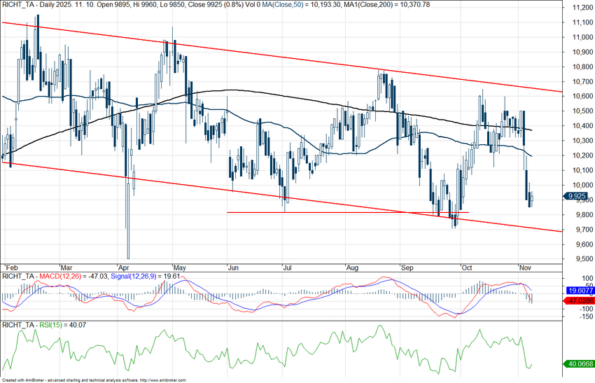 Nem szerepelt erősen a Richter az előző héten, ma reggelre viszont valamivel jobb teljesítmény mutatkozik. Az árfolyam a technikailag is fontos mozgóátlagokat letörte, valamint a 10 ezer forintos szint alá került, ugyanakkor három negatívabb nap után ma már kisebb plusz mutatkozik. A befektetők a vártnál gyengébb negyedéves számokat nem fogadták pozitívan. A főbb támaszok 9700, illetve 9900 forint körül lehetnek rövid távon, míg az ellenállásokat most már a korábbi mozgóátlagoknál, illetve a 10 500 forintos szinten találhatjuk.