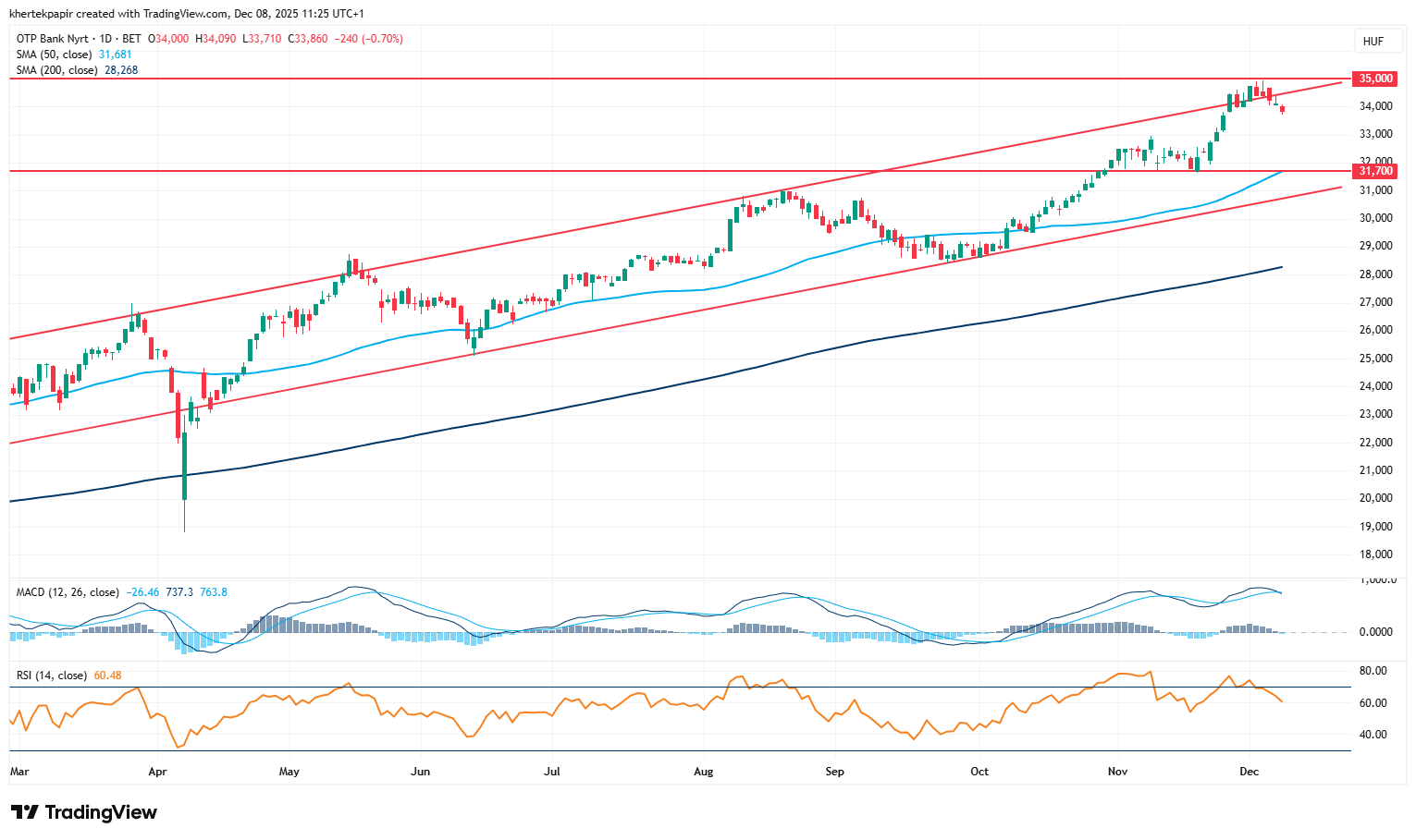 Kifulladt az OTP részvényének lendülete az előző héten, így az árfolyam egyelőre nem tudta áttörni a 35 ezer forintos szintet. A mai napon sem találja az erőt a bankpapír, így már a 34 ezer forintos szint alá tért vissza az árfolyam. Az RSI túlvettséget mutatott az előző héten, de ezen a héten már az MACD jelzése is eladásba fordult át. Az OTP technikai képe rövid távon tehát már inkább lefordulás jeleit mutatja, de a hosszú távú trend változatlanul emelkedő. A fennálló 150 milliárd forintos részvény-visszavásárlási keretből eddig körülbelül 120 milliárdnyi saját részvényt vásárolt vissza az OTP, tehát megközelítőleg 30 milliárd forintnyi visszavásárlásra van még lehetősége a banknak az év végéig.