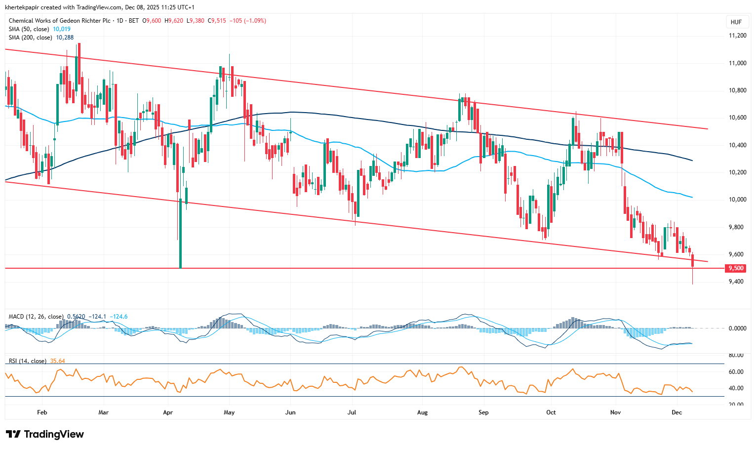 Gyengébben kezdte a hetet ma a Richter, az árfolyam 9400 forint környékén is járt, bár napon belül azért sikerült javítani. Jelenleg 9520 forint körül mozog a papír, az elmúlt hetekben inkább egy lefelé tartó trend érvényesült az árfolyamnál, és a 9600 forint körüli támaszt is mintha letörte volna a papír. A következő támaszok az áprilisi lokális mélypontot jelentő 9500 forintnál, illetve 9200-9400 forint környékén helyezkedhetnek el, míg a közép távú ellenállás már a lélektanilag is fontos 10000 forintos szintnél lehet, hamarosan pedig az 50 napos mozgóátlag is hasonló szinteken mozoghat.