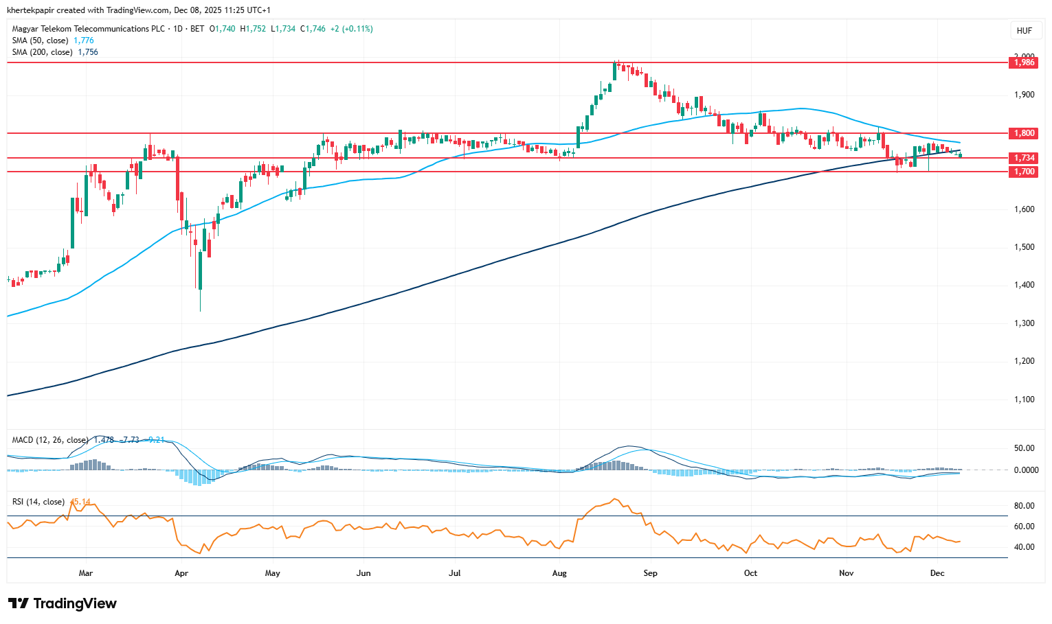 Nincs nagy mozgás a Magyar Telekom részvénye körül, hiába hozott erős profitszámokat a legutóbbi negyedéves gyorsjelentés, érdemi lendületet nem tudott venni a részvény, így továbbra is a mozgóátlagok környékén ragadt meg az árfolyam, védelmet az 1700 forintos szintek képezhetnek. Akadályként az 50 és 200 napos mozgóátlag felett az 1800 forintos szinteket érdemes figyelni, ennek áttörése adhatna nagyobb löketet, amelynek köszönhetően akár a 2000 forint körüli szintekig kapaszkodhatna a papír.