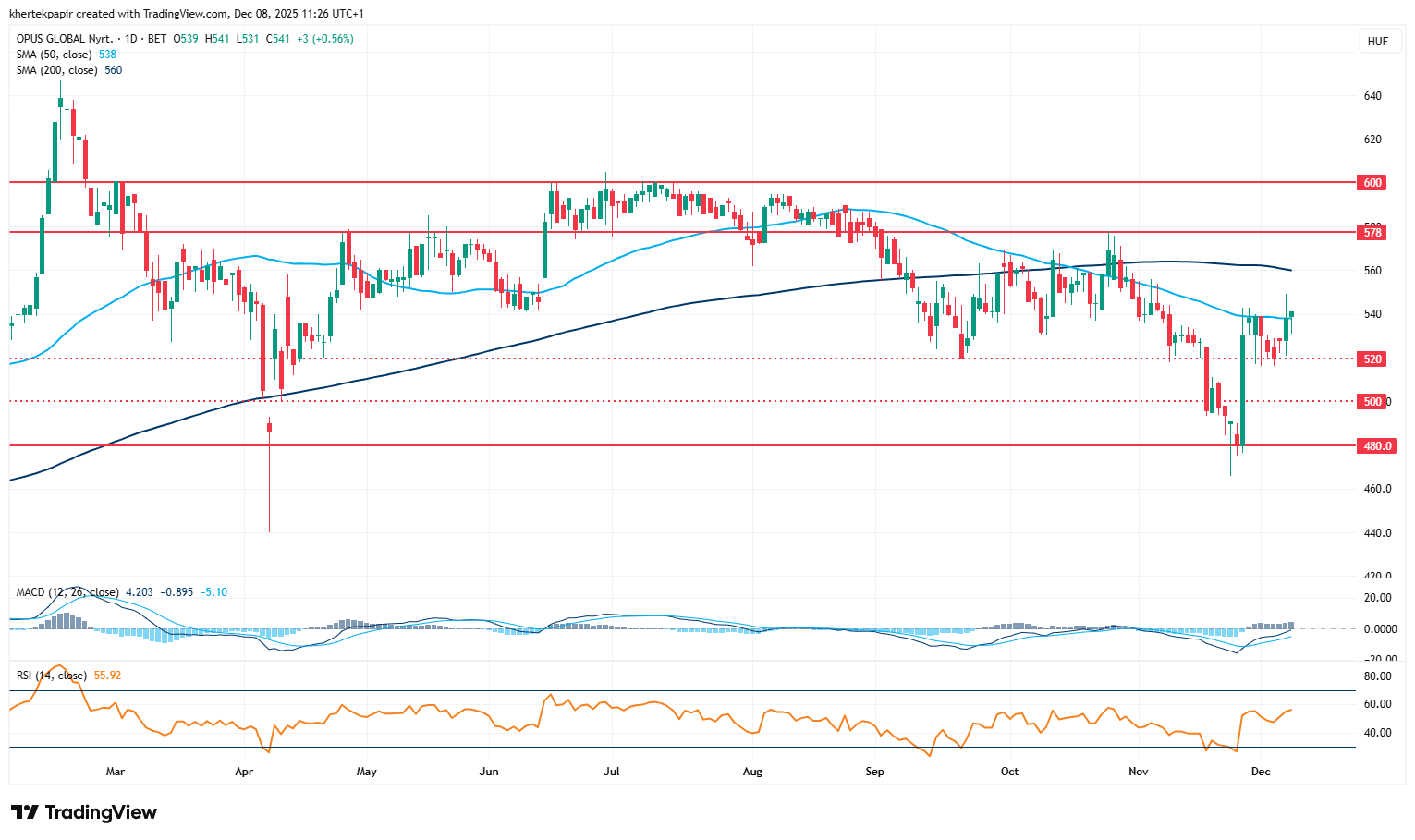 Egyelőre továbbra is erős akadályba ütközik az Opus részvénye, technikailag az 50 napos mozgóátlag többszöri tesztelést követően sem került áttörésre, így az árfolyam az 520-540 forintos sávban ingadozhat tovább. A befektetők a társaság jövő hét hétfőn (december 15-én) esedékes gyorsjelentésére figyelhetnek majd, amelyben a harmadik negyedéves eredményeit publikálhatja az Opus.