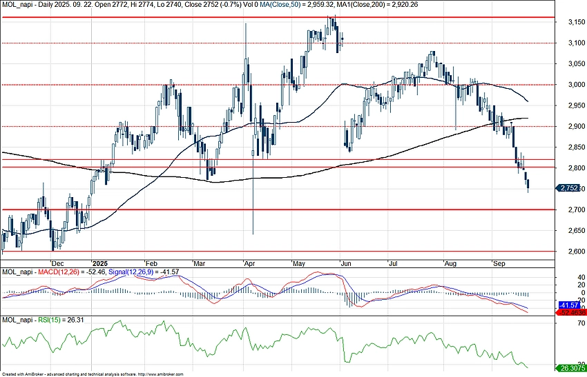 Nem tud egyelőre fordulatot produkálni a Mol, amely az utóbbi időben alulteljesítő a piacon, így több fontos támaszszintet is letört az elmúlt hetek során az árfolyam. Az indikátorok alapján egyébként túladottnak tűnik már a részvény, de egyelőre a gyengébb hangulat, a geopolitikai bizonytalanságok, és a mérséklődött energiaárak is némi akadályt gördítenek a növekedés elé. Fontosabb támaszt még a 2700-2730 forint körüli szintek képezhetnek egyébként, míg lejjebb a 2600 forintos zóna nyújthat segítséget.