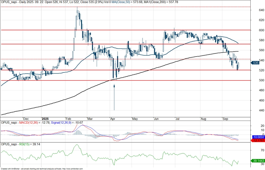 Közeleg az Opus idei első féléves gyorsjelentése, amelyet várhatóan szeptember 30-án, vagyis jövő hét kedden publikál a társaság. Az Opus árfolyama egyébként tovább gyengült az előző héten, így a visszaesés során az 520 forintos szintet is érintette, majd innen pattant vissza az árfolyam. Ellenállásként a korábbi sáv alja azonosítható 540 forintnál, illetve távolabb a 200 napos mozgóátlag szintje.