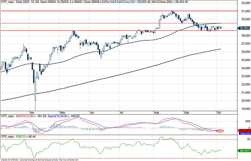 Nagyobb kilengés egyelőre nem látható az OTP részvényénél, 29 ezer pont környékén oldalazik az árfolyam. A további emelkedéshez az 50 napos mozgóátlagot kellene átvinnie az OTP részvényének, utoljára szeptember első felében járt a mozgóátlag felett az árfolyam. A 28 600-28 700 forint körüli támaszzóna láthatóan megfelelő védelmet nyújtott az utóbbi hetekben, így innen eltávolodva tudna újult lendületet szerezni a részvény. Ebben segíthet, hogy az MACD jelzése már vételbe váltott át múlt pénteken, miközben az RSI semleges szinteken mozog egyelőre.