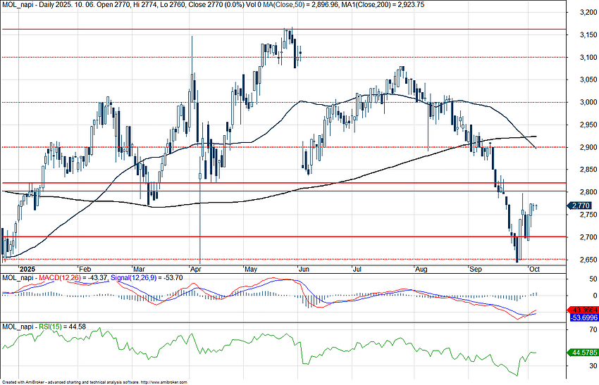 Kisebb felpattanást produkált a múlt hét során a Mol, amely rövidebb időre 2650 forint alá is süllyedt, mostanra viszont a 2800 forintos szinteket közelítené. A javuló piaci hangulat tehát a Mol számára is támogatást nyújthat, miközben ma délelőtt az olajárak is óvatos emelkedést produkálnak. Technikailag a halálkereszt megjelenése a grafikonon nem a legkedvezőbb jel a részvény számára, de az indikátorok már túladottságot jeleztek, így az MACD is nemrég adta be a vételi jelzését. Ellenállást így a mozgóátlagok képezhetnek, valamint a 2800 forintos akadály azonosítható a közelben.