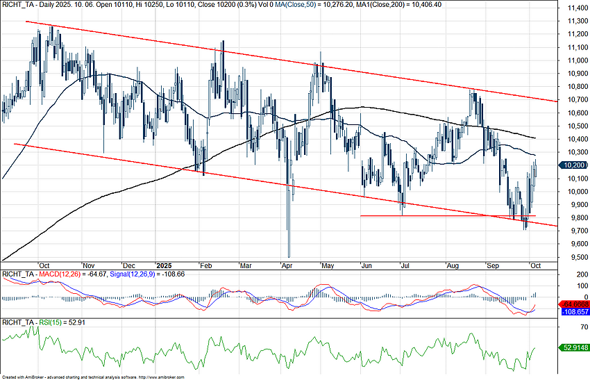 Szép felpattanást mutatott a Richter árfolyama az előző napokban, ma reggel pedig már 10 200 forint körül jár a részvény, így a szeptember közepi szintekre került vissza. Látható, hogy a magyar piacon is javult valamelyest a hangulat, illetve az amerikai és európai egészségügyi szektor is szép felpattanást mutatott, ez szintén segítette a Richtert is. A forint ezzel együtt továbbra is jó erőben van, ez az exportbevételekre így valamelyest negatív hatást gyakorolhat a cégnél.