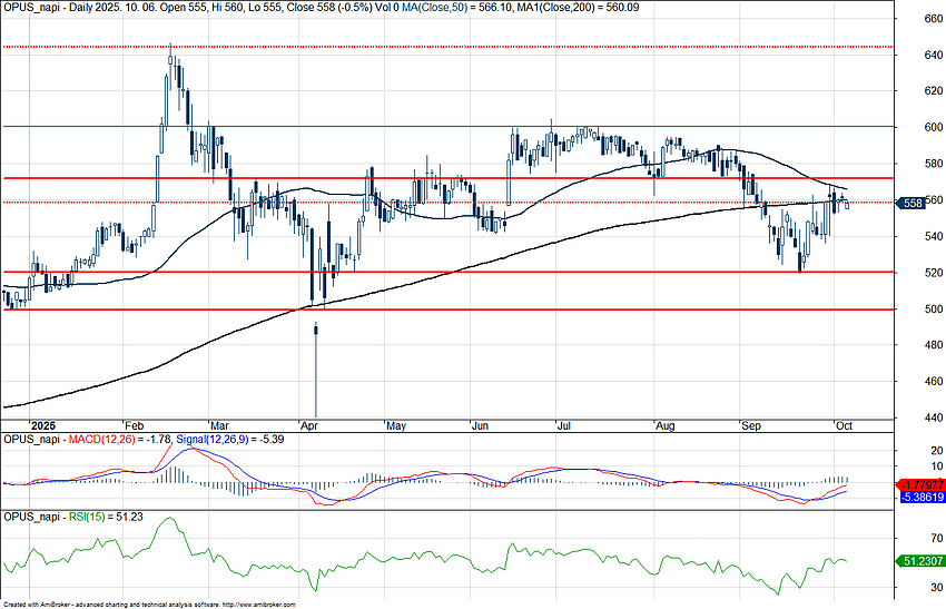 Az elmúlt héten közzétett gyorsjelentése után erősödésre volt képes az Opus, így a részvény árfolyama az 50 napos mozgóátlagáig emelkedett. Ez a szint jelenleg ellenállásnak bizonyult, így az árfolyam a 200 napos mozgóátlag környékén mozog, ami 560 forintos szintet jelent. A cégcsoport eközben folytatta megkezdett részvény-visszavásárlási programját, a társaság közvetlen saját részvény állománya 23,17 százalékra emelkedett a mai bejelentés alapján.