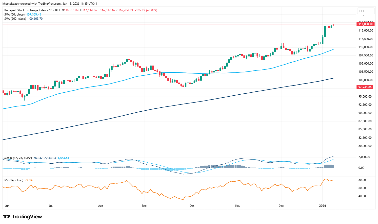 Remek teljesítménnyel kezdte a 2026-os évet a hazai tőzsde, a BUX index az elmúlt hét során 4,6 százalékos emelkedésével a 116 ezer pontos szinten is túljutott. A ma reggeli órákban már a 117 ezer pontos szintet tesztelheti az index, amely egyelőre ellenállásként funkcionál a BUX árfolyama előtt. Láthatóan a kedvező európai részvénypiaci hangulat mellett az OTP további erősödése is hozzájárult az újabb csúcsok eléréséhez.