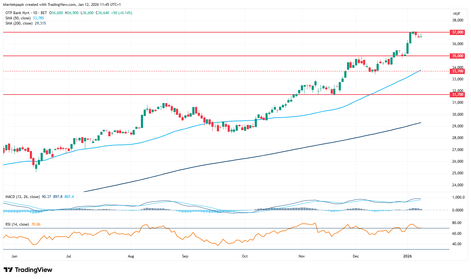 Igen erősen indította az előző heti kereskedést az OTP részvénye, így szerdán már a 37 ezer forintos szintet is érintette az árfolyam. Az ezt követő napokban viszont már nem tudta folytatni a növekedést az árfolyam, egyelőre tehát a 37 ezer forintos szint kisebb ellenállást jelentett a grafikonon. De hosszabb távon egyelőre töretlen az OTP emelkedő trendje, az igen erősre sikeredett 2025-ös év után 2026 első kereskedési hetét 4 százalékos teljesítménnyel zárta a részvény.