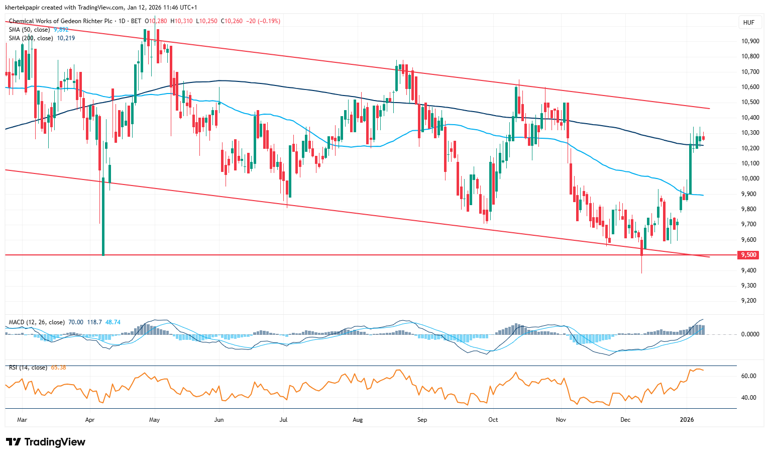 Erősen kezdte az évet a Richter, nagyjából 4 százalékot erősödött az év eleje óta, de az még fontosabb, hogy technikailag is kedvezőbb kép alakult ki, miután a 200 napos mozgóátlaga fölé került. A 10200 forint körül mozgó szint így fontos lehet rövid-közép távon is, a fontosabb ellenállások pedig 10500-10600 forint körül találhatóak, ami még az október végi-november eleji lokális csúcsokat jelenti. A negyedik negyedéves gyorsjelentést egyébként még jóval később, a tervek szerint február 27-én teszik csak közzé.