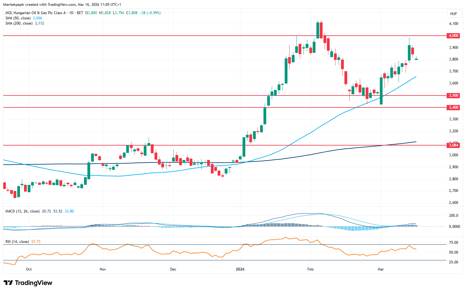 A hetet gyengébben indította a Mol is a többi blue chiphez hasonlóan, azonban látni kell, hogy a múlt hét során már a 4000 forintos szinteket is meg tudta közelíteni a részvény, ráadásul év eleje óta is a legjobban teljesítő BUX-komponensnek számít a Mol. Támaszt a részvény számára az 50 napos mozgóátlag képezhet, valamint a 3400-3500 forintos zóna nyújthat támogatást még lejjebb. Az olajpiacokon látható volatilis mozgások hatására a nemzetközi olajipari társaságok is javulásnak tudtak indulni, így Európán belül is felülteljesítésre képes az energiaszektor.