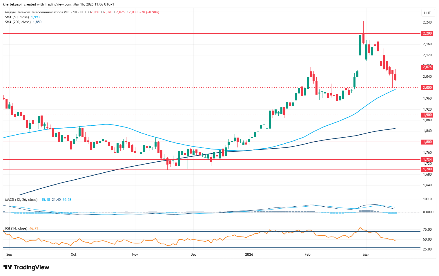 Nem találja az erőt a Magyar Telekom részvénye sem, így a 2200 forintos szintekről lassú lecsorgásnak indult az árfolyam, múlt hét során már a 2000 forintos szinteket is érintette a papír. Védelmet az 50 napos mozgóátlag képezhet, míg lejjebb még az 1900 forintos szintekre lehet érdemes figyelni. A legutóbbi gyorsjelentés során részvényenként 154 forintos osztalék kifizetésére tett javaslatot az Igazgatóság, így a Közgyűlés jóváhagyására várhatnak a befektetők ennek kapcsán.