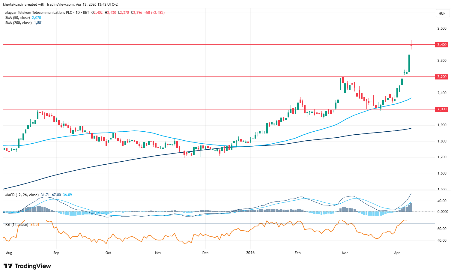 Zsinórban negyedik hete mutat markáns erősödést a Magyar Telekom részvénye, így 2400 forintos szintek fölé emelkedett immár a papír, jelentősen eltávolodva a korábbi ellenállási szintektől. A 2200 forintos zóna áttörését követően tudott újabb lendületet venni a részvény, így a jövőben ez, illetve az 50 napos mozgóátlag képezhetne védelmet egy gyengébb hangulat közepette. A gyors és nagyobb mértékű emelkedés hatására egyébként az indikátorok grafikonjain is már túlvettség jelei kezdtek el kirajzolódni, így a 80 feletti RSI mutató némi óvatosságra intheti a befektetőket is.