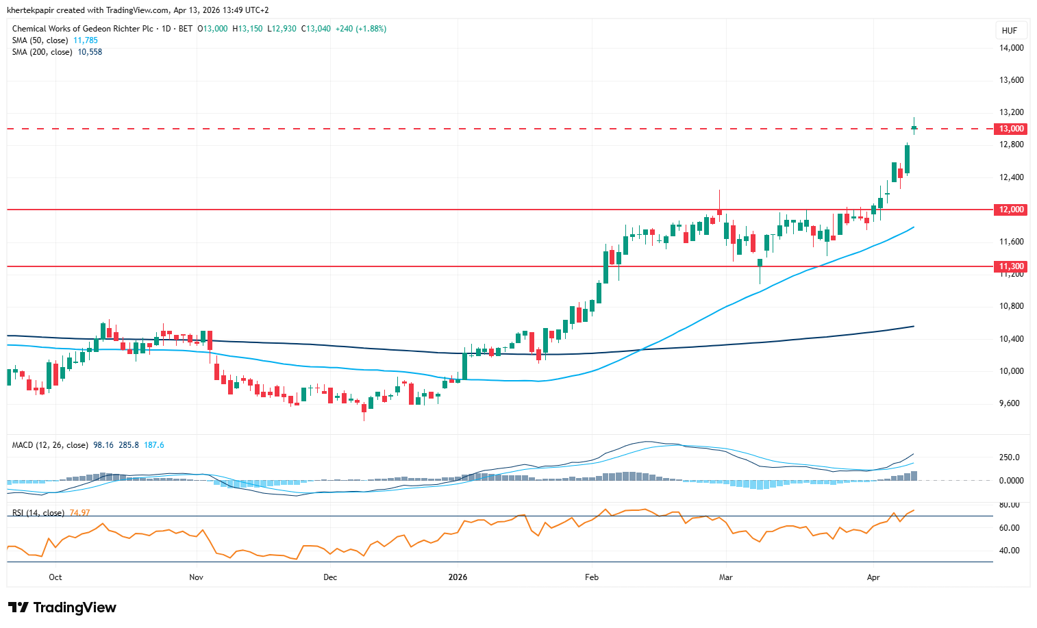 Erősen kezdte a Richter részvénye is a mai kereskedést a kedvező részvénypiaci hangulat közepette, az árfolyam 13 100 forint felett is járt, ugyanakkor a későbbi órákban már inkább oldalazást mutatott, egyelőre a 13 000 forintos szintek környékén jár a papír. A történelmi csúcson lévő árfolyam ezzel technikailag is kedvező képet mutat, így a főbb támaszokat inkább a 13 000 forintos szintnél lehet érdemes figyelni, illetve az is kérdés, hogy nap végéig hogyan tud teljesíteni az árfolyam.