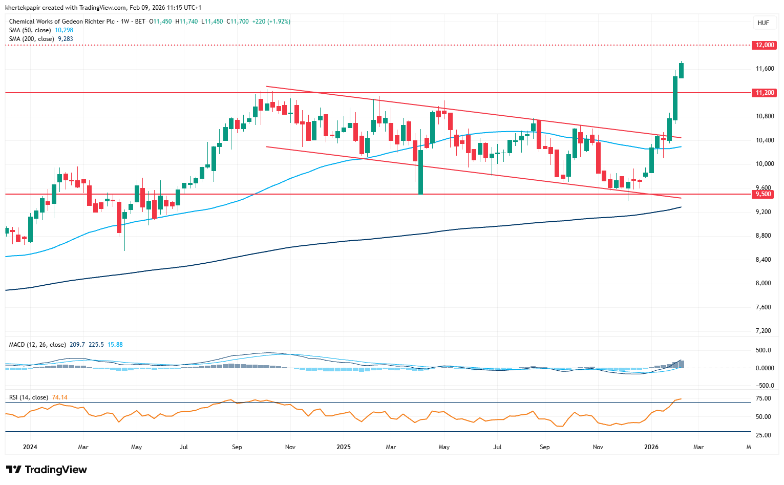 Remek formában van a Richter az elmúlt napokban, a magyar piacon látható kedvezőbb hangulat is segíthette a papírt az utóbbi időben, az árfolyam ma pedig 11 700 forint felett is járt, amivel új történelmi csúcsot döntött. Technikailag látható, hogy egy hosszú ideig fennálló csökkenő trendcsatornából sikerült kitörni, a korábbi csúcsok áttörése után pedig már a lélektanilag is fontos 12 000 forintos szint lehet a következő ellenállás. Támaszokat főleg a korábbi csúcsok környékén, 11200-11300 forint környékén lehet azonosítani.