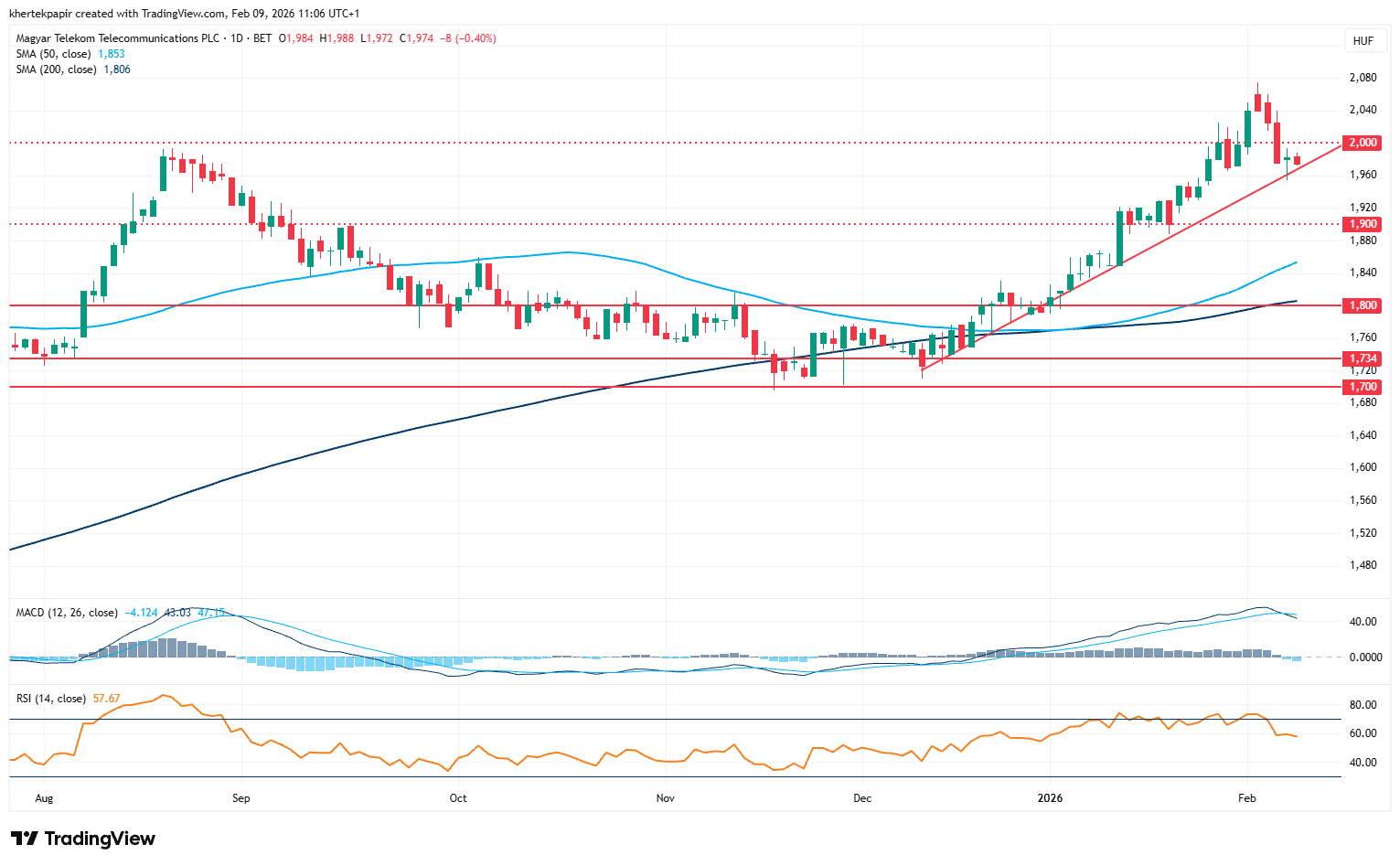 Múlt hét során ugyan kisebb visszaesés zajlott le a Magyar Telekom grafikonján, de az emelkedő trendvonal továbbra is védelmet nyújthat, így jelenleg is a 2000 forint körüli szinteken mozog a részvény. Lejjebb még a két mozgóátlag, az 50, illetve a 200 napos mozgóátlag funkcionálhat támaszként, valamint az 1900 forintos szintekre lehet érdemes még figyelni. A befektetők a február végén érkező negyedéves gyorsjelentésre is várhatnak, hiszen várhatóan kiderülhet, mekkora mértékű részvényesi juttatást javasol a vezetőség.
