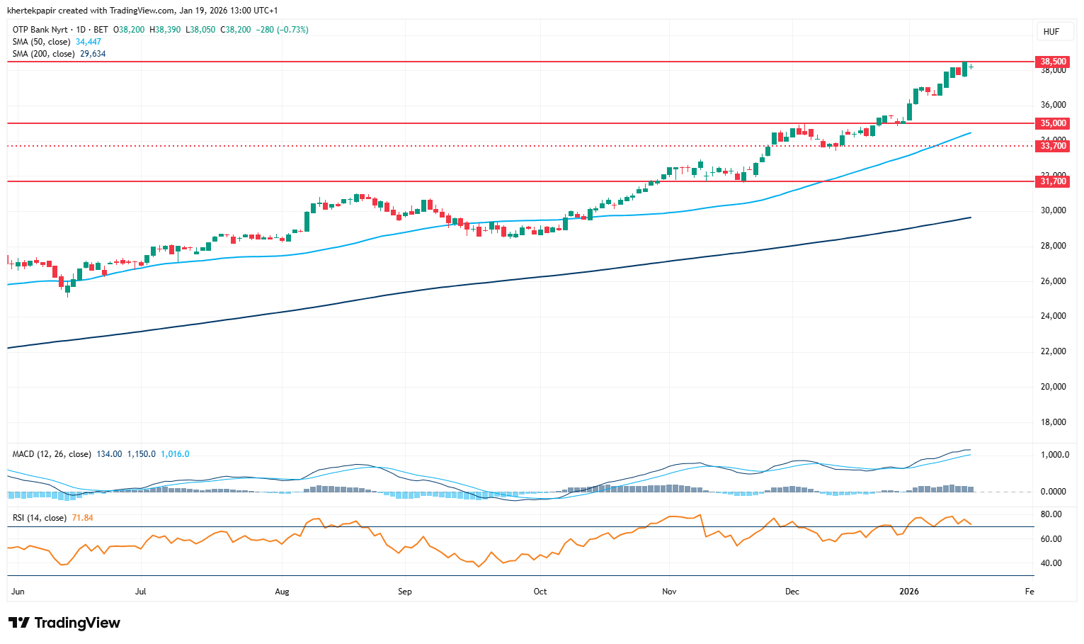 Folytatta erőteljes lendületét az OTP részvénye az elmúlt héten is, pénteken újabb csúcsot beállítva 38 ezer forint felett zárt a bankpapír. Ezzel a következő ellenállási szint a jelenlegi csúcsnál, 38 500 forintnál húzódik az OTP árfolyama előtt, ennek áttörésére figyelhetnek a befektetők. A ma reggeli órákban egyelőre a 38 ezer forintos szint körül tartózkodik az árfolyam, a gyengébb piaci hangulatban csökkenéssel indította a hetet az OTP részvénye is.