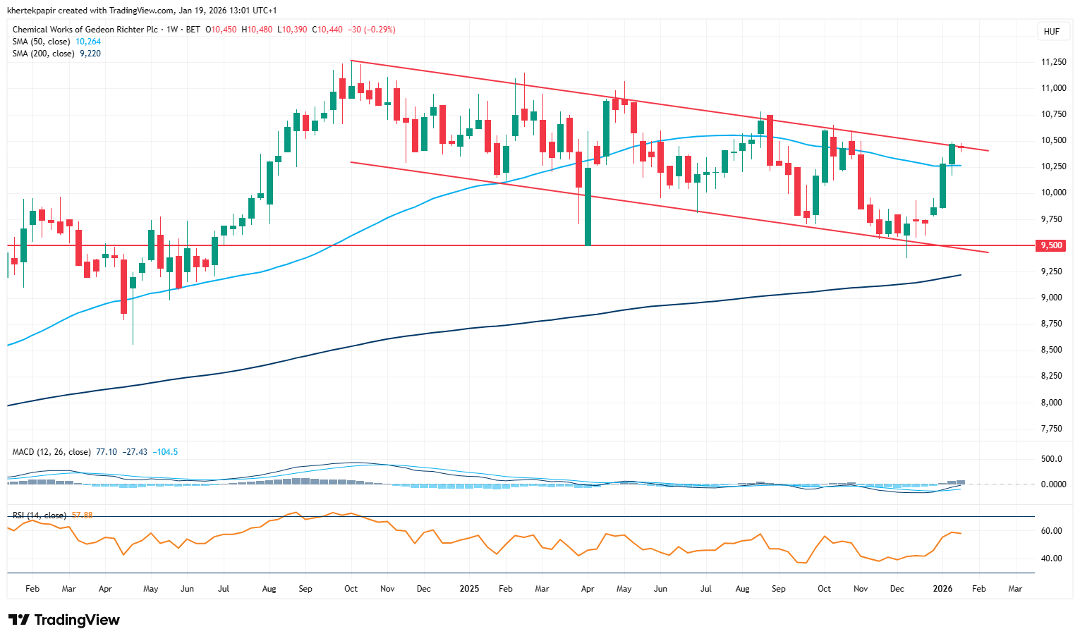 Az idei erős évkezdésnek köszönhetően sokat javult a Richter technikai képe, az elmúlt héten a kedvező piaci hangulatban tovább tudott erősödni a részvény. Az árfolyam az 50 hetes mozgóátlagról pattant fel, és jelenleg a 2024 októbere óta tartó csökkenő trendcsatorna felső szakaszát tesztelheti a 10 500 forintos szint közelében. A ma délelőtti órákban kisebb korrekcióval indult a hét a Richter részvényénél is, így egyelőre a technikai áttörésre még várni kell.