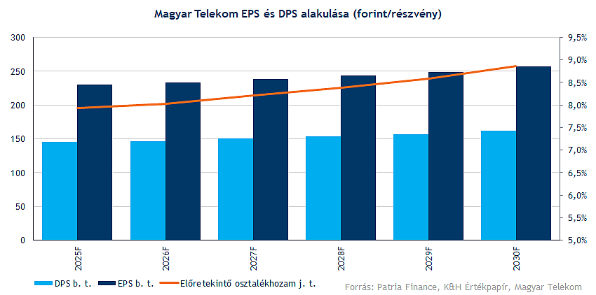 - A profittermelés javulásával a részvényesek javadalmazása is tovább növekedhet. Hosszabb távon 90 százalékos kifizetési arány várható, ami részvényenként 207 forintos (osztalék + részvény-visszavásárlási program) juttatásnak felel meg az idei eredmények után. A társaság nagyobb hangsúlyt fektethet az osztalékokra (145 forint/részvény), ezzel együtt folytathatja a részvényvisszavásárlási programot is a következő években. Az előretekintő hozamok (osztalék + részvény-visszavásárlási program) továbbra is vonzóak (FY26: 11,3% / FY27: 11,5% / FY28: 11,7%).