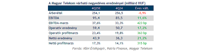 A 2025-ös évben szüneteltetésre kerülő inflációkövető díjkorrekció lassuló bevételnövekedési ütemet eredményezett, miközben az SI/IT bevételek is elmaradtak a bázis szintektől. Ez a tendencia a negyedik negyedévben is fennállhatott, míg profit oldalon továbbra is nagyobb mértékű növekedés mutatkozhat az alacsonyabb bázisszintek, és a kedvező adóhatások miatt. A korábban kitűzött 200 milliárd forintos tisztított nettó profitot meghaladó eredményt érhetett el a társaság 2025-ben, így tér nyílhat az osztalékkifizetésének emelésére is. A gyorsjelentést február 25-én, piaczárást követően teszi közzé a társaság.