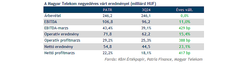 A harmadik negyedévben is jelentős profitnövekedésre lehet számítani az alacsonyabb tavalyi bázishoz képest. Az infláció-követő díjkorrekció felfüggesztése és a gyengébb SI/IT üzletág miatt azonban a bevételek várhatóan a tavalyihoz hasonló szinteken maradhatnak. Bár az EBITDA kapcsán az előző negyedévhez képest enyhe csökkenés várható, de így is 107 milliárd forint körüli eredményre van kilátás, a nettó nyereség pedig akár 55 milliárd forintra emelkedhet, ezzel tartva a korábban kijelölt éves célokat. A Telekom november 12-én, piaczárás után teszi közzé harmadik negyedéves jelentését.