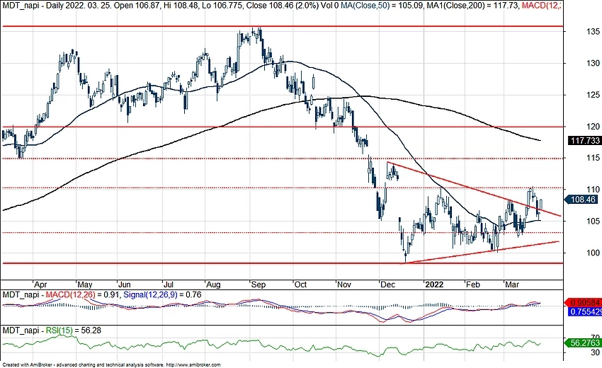 Pozitív fordulat kezd kirajzolódni a Medtronic árfolyamán, egy szűkülő háromszög alakzatból tudott kitörni az árfolyam, majd egy rövid visszatesztelést követően ismét emelkedésnek indult a papírt. Az elmúlt időszakban az 50 napos mozgóátlagot is sikerült áttörnie a részvénynek, amelyet a múlt héten újból érintett, ezt követően újra lendületet tudott venni a Medtronic.