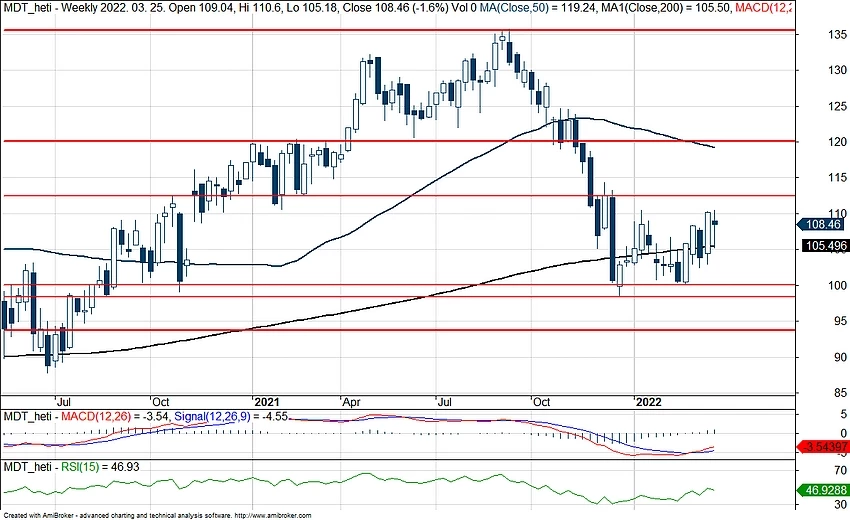 Az 50 napos mozgóátlag szolgálhat védelemként a Medtronic számára, illetve nem messze alatta a 102 dolláros szint jelenthet támaszt. A 98-100 dolláros zóna lélektanilag fontos szintet képviselhet, hiszen utoljára 2020 nyarán tartózkodott ennél alacsonyabb szinteken az árfolyam, így ez a tartomány menedéket nyújthatna a bajban. Indikátorok egyelőre nem járnak kritikus zónákban, emellett pozitív trendet láthatunk esetükben.