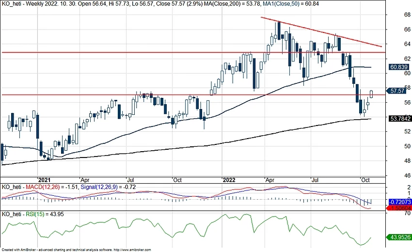 A 200 napos mozgóátlag erős támaszt nyújtott eddig az amerikai cégóriás árfolyamának, a részvény technikai képét megerősítette, hogy szeptemberben vissza tudott pattanni az árfolyam az átlagról. Fontos támasz volt még az 50 napos mozgóátlag is, egészen szeptember második hetéig tartotta magát, amikor is az árfolyam először törte le az elmúlt másfél évben. Az viszont jó hír, hogy az 57 dolláros szint most nem képezett ellenállást az október eleji esést követően, a tegnapi kereskedési napon áttörte az árfolyam a fontos árszintet, és a növekedés ma sem fulladt ki a kedvező jelentésre reagálva.