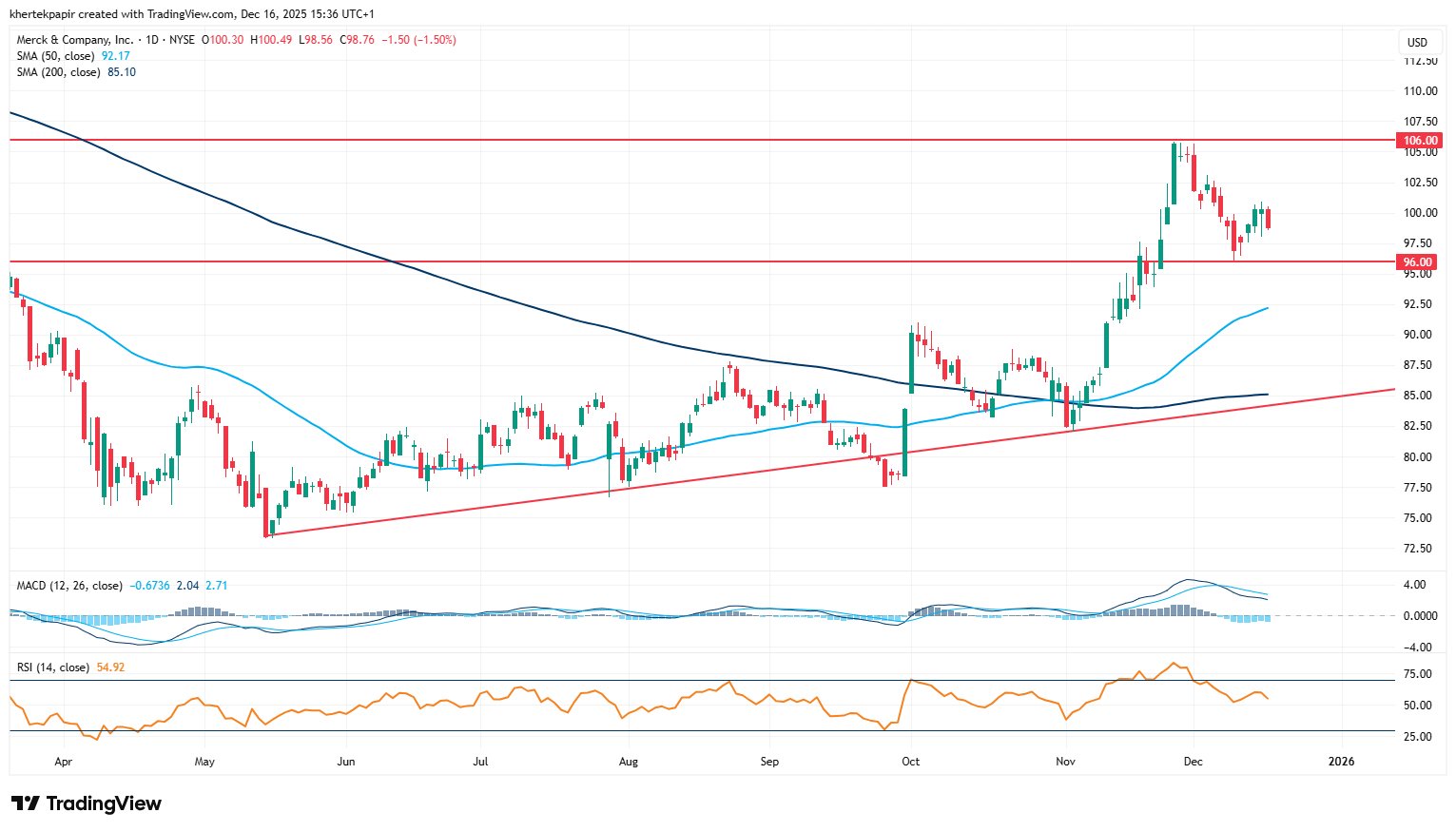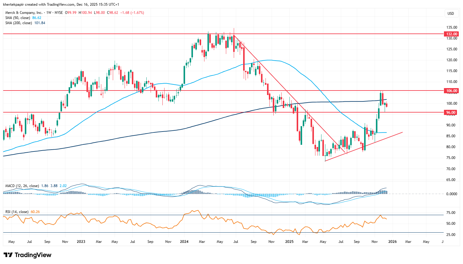 Az amerikai egészségügyi részvények 2025 második felében jelentős erősödést mutattak fel, így sikerült javítaniuk a gyengébb első félév után. Az emelkedésből a Merck részvénye sem maradt ki, a gyógyszergyártó szempontjából is kedvező volt, hogy csökkent a vámokkal kapcsolatos bizonytalanság. Emellett a kulcsfontosságú Keytruda készítmény új formuláját még szeptemberben hagyta jóvá az FDA, ami szintén kellemes hír volt a részvényesek számára. A Merck árfolyama ennek köszönhetően új idei csúcsra tört ki, és most egy kisebb korrekció után akár folytatódhat az emelkedő trend.