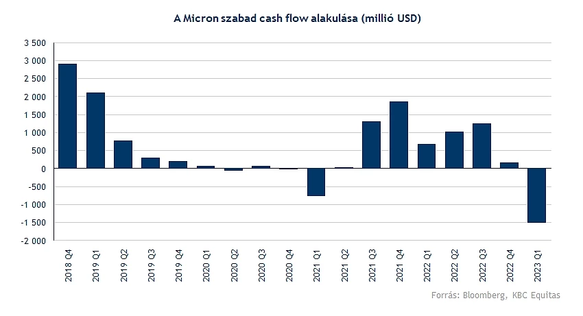 Az előző negyedévekben látott pozitív cash flow termelés pedig átváltott a negatív tartományba. A negyedév során 2,5 milliárd dollár volt beruházásra fordított összeg, ezt pedig messze nem érte el a működésből származó cash flow, amely miatt mínusz 1,5 milliárd dollár volt a szabad pénzáramlás. Ennél nagyobb összeget több negyedévre visszamenve sem láthatunk a Micron esetében.