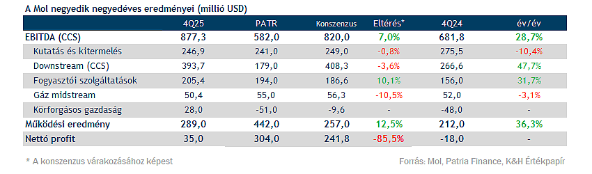 Erőteljes negyedik negyedévet produkált a társaság, 877 millió dolláros CCS EBITDA-t elérve, amivel meghaladta a konszenzus előzetes várakozását is. A Downstream szegmensben a Dunai Finomítói tűzeset ellenére is erős teljesítmény mutatkozott, a kiemelkedő finomítói marzsok kompenzálni tudták az incidens miatt kieső volument. 394 millió dolláros CCS EBITDA-t ért el itt tehát a cég, miközben a Petchem továbbra is veszteséget termel. A finomító helyreállítása a harmadik negyedévre fejeződhet be, ami nagyjából 50 millió dolláros extra CapEx kiadást jelent a társaság számára.
