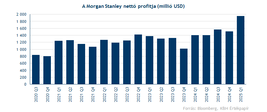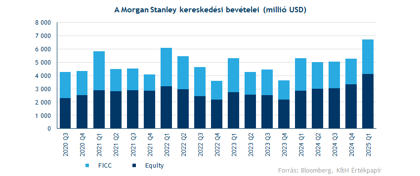 A második legfontosabb, kereskedési üzletág viszont kifejezetten erős periódust zárt, összesen 6,7 milliárd dolláros bevétele keletkezett ezen a soron a banknak. Ezzel túllépte a korábbi, 2022-es rekordidőszakot a kereskedési divízió. Az talán nem lehetett meglepetés, hogy erős számok érkeznek ebben a szegmensben látva az elmúlt hetek piaci volatilitását, de a piaci várakozást így is sikerült bőven felülteljesíteni az első negyedév során. A részvénykereskedés után 4,1 milliárd dolláros bevétele keletkezett a Morgan Stanleynek, ami 700 millióval (!) több lett a piaci prognózisnál. Emellett a FICC kereskedési bevételek is erősen alakultak, bár a felülteljesítés itt elmaradt.