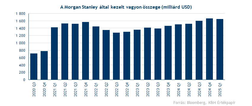 A Morgan Stanley összbevétele 17,4 milliárd dollárra rúgott az első negyedévben, ami újabb rekordot jelent a bank történelmében. Éves alapon 17 százalékos a javulás, de voltak azért olyan szegmensek, ahol az előző negyedévben látott lendület mintha már akadozna valamelyest. Az egyik ilyen a vagyonkezelési üzletág, ami a legnagyobb hányadát teszi ki az összbevételeknek. Innen összesen 7,33 milliárd dolláros bevétele származott a banknak, ami nem csak 2024 Q4-es 7,48 milliárdtól marad el, de a Bloomberg elemzői konszenzus 7,44 milliárdos várakozásától is. Ha megnézzük a kezelt vagyon összegét, hamar kiderül mi okozta ezt az elmaradást. A vagyonkezelési ág AUM-je (Assets Under Management) ugyanis 1 százalékkal lecsökkent negyedéves alapon, ami az első zsugorodás 2023 harmadik negyedéve óta. A pénzpiaci alapokból nagyobb mértékű nettó kiáramlás volt látható a negyedév során, összesen 19 milliárd dollár.