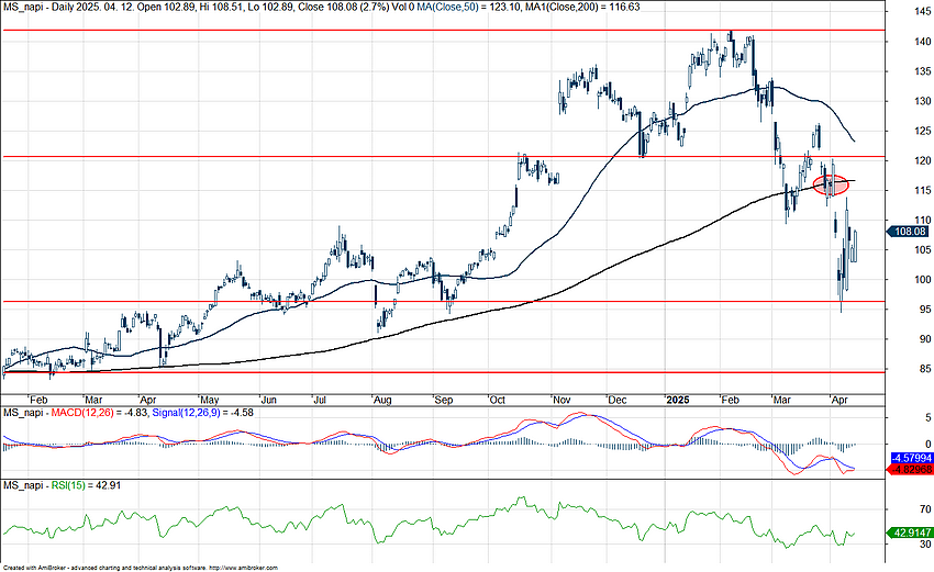 Az idei év eddig a Morgan Stanley számára sem úgy alakult, mint azzal az év elején számolhattak a befektetők, így a hosszú távú támaszt jelentő 200 napos mozgóátlagot is letörte a részvény árfolyama. Így újabb védelmi szintek kijelölése aktuális a napi grafikonon. A hétfői napon még a 96 dolláros szintnél tudott erőt gyűjteni a részvény, így rövidebb távon ez is egy fontos támaszszintet képezhet akár, a következő markáns védelmi szint már 84 dollár környékén azonosítható. A hétfői visszaesést követően az amerikai bankszektor részvényei, és így a Morgan Stanley is újból erőre talált, bár a volatilitás még mindig nagyon magas, és a hosszabb távú, több hónapos trend egyelőre még csökkenő. A közeljövőben várhatóan folytatódhatnak a kilengő napi mozgások, emiatt nincs egyszerű dolga a befektetőknek. A jelentést követően kisebb csökkenéssel indított a kereskedést a részvény, de a nagyobb piaci volatilitás miatt akár napon belül is gyorsan megfordulhat a befektetői szentiment.