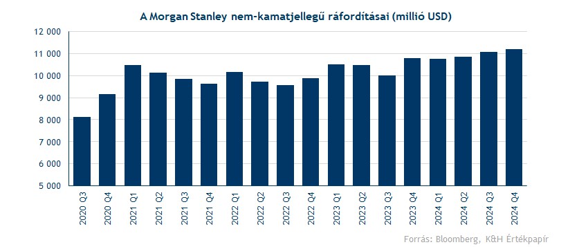 A hagyományos befektetési banki bevételek már „csak” 25 százalékkal növekedtek éves szinten, ami nem egy gyenge eredmény, de a konszenzus ennél magasabb, 30 százalékos javulással számolt. Viszont azt is látni kell, hogy a kereskedési vagy vagyonkezelési üzletághoz képest eltörpülnek a befektetési banki bevételek, az 1,6 milliárd dolláros negyedéves eredmény az összebevételnek mindössze csak 10 százaléka. Továbbá, ha az egész évet nézzük, 2024-ben 35 százalékos növekedést ért el a Morgan Stanley 2023-hoz képest, a trend tehát pozitív. 2025-ben pedig várhatóan még tovább javulnak a befektetési banki tevékenység után befolyó bevételek, az M&A és IPO piac felpörgésével több ügyletre, és ezzel együtt több tanácsadói bevételre számíthatnak a befektetési bankok, miközben az egyes ügyletek után beszedett díjak is folyamatos emelkedést mutatnak.