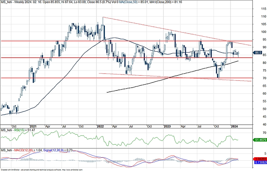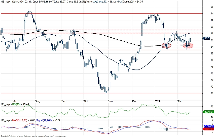 Nem indította kifejezetten erősen a 2024-es évet a Morgan Stanley részvénye, viszont a 200 napos mozgóátlagát továbbra sem törte le. A napokban is a mozgóátlagról tudott fordulatot mutatni árfolyam, emellett már az MACD is közelíti a vételi jelzést a napi grafikon alatt, az idei évben először. 2024-ben fundamentális oldalról az M&A piac felpörgése segíthetné a Morgan Stanley teljesítményét, emellett a vagyonkezelési üzletágban is folytatná terjeszkedését a bank.