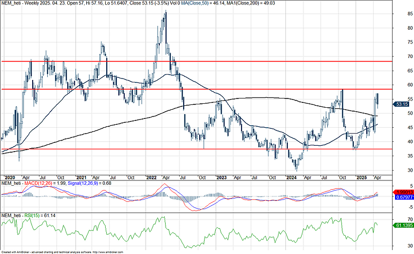 Az arany árfolyamának emelkedésével együtt a Newmont is megközelítette a lokális csúcsszintjeit, az 58 dolláros zónától nem jár már túl messze a részvény. A történelmi csúcsok egyelőre távolabb helyezkednek el, de az arany stabilitásának és kedvező kilátásainak köszönhetően a Newmont is tovább menetelhetne, így elsődleges cél az 58 dolláros szintek áttörése lehetne a papírnak. Támaszokat egyébként a mozgóátlagok nyújthatnak, idővel akár az aranykereszt képe is kirajzolódhat a heti grafikonon, amelyre már hosszú évek óta nem volt példa.