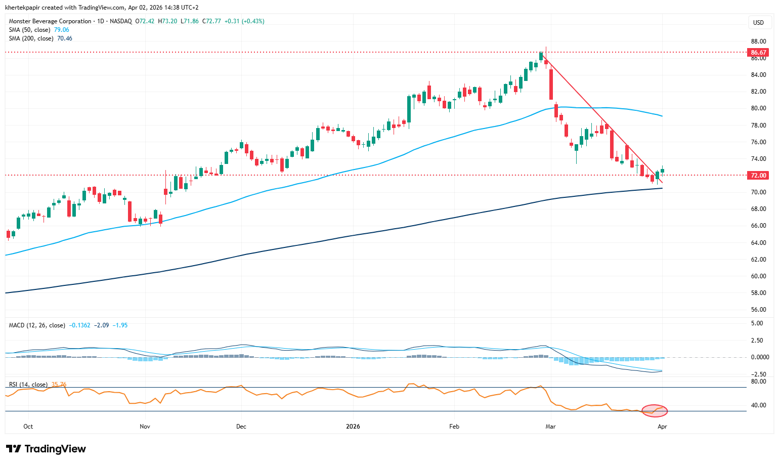 A napi grafikont nézve kedvező, hogy a héten még a 200 napos mozgóátlag előtt tudott kisebb felpattanást mutatni a Monster árfolyama. Ezzel egyébként megtörni látszik az a negatív trendvonal, ami az elmúlt egy hónapban bekorlátozta a részvény teljesítményét. Tehát amennyiben nem töri le a mozgóátlag szintjét a részvény, a pozitív trendfordulóhoz adottak lehetnek a feltételek technikai szempontból.