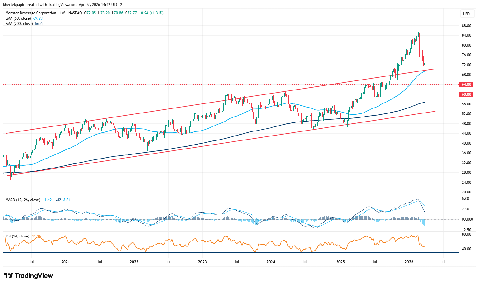 Az utóbbi években láthatóan folyamatos emelkedést mutatott a Monster árfolyama, tavaly év végén és idén év elején pedig már nagyobb lendületet vett a részvény. Bár ezt egy visszahúzás követte már márciusban, de a hosszú távú trenddel alapvetően nincs probléma a Monster esetében.