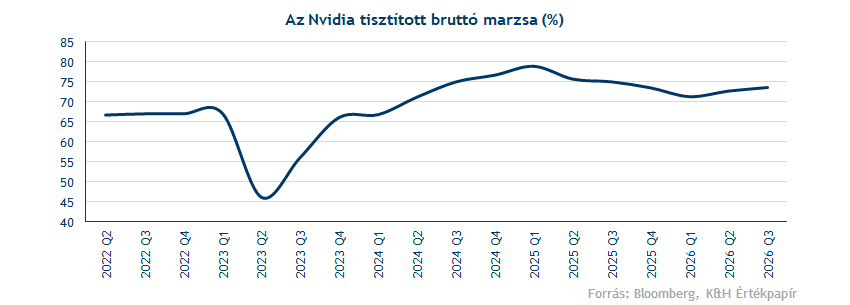 A pozitív trend az év végén is folytatódhat, hiszen az előttünk álló negyedik negyedévben a társaság 65 milliárd dolláros bevételt (konszenzus: 63 milliárd dollár) és 75 százalékos tisztított bruttó marzsot vár (konszenzus: 74,5 százalék). Egyébként a most lezárult negyedévben a bruttó marzs 73,6 százalék volt a második negyedév 72,7 százaléka után, ami megfelelt mind a céges előrejelzésnek, mind a piaci konszenzus várakozásának. A bruttó marzs fokozatos visszatérése a kívánt 75 százalékos szint felé elsősorban a Blackwell chipek gyártásának javuló hatékonyságának köszönhető.
