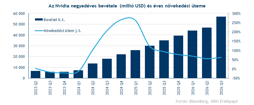 Az Nvidia sikeresen felülteljesítette a várakozásokat a most zárult negyedévben, így 57 milliárd dolláros bevételt ért el. Ez 62 százalékos éves növekedést jelent, tehát újra gyorsul a növekedési ütem. Továbbra is a Blackwell chipek eladásai hajtják a cég bevételeit, de a vezetőség optimista annak kapcsán, hogy jövőre már az új Ruby széria gyártása is elindulhat. Az erős harmadik negyedéves eredmények mellett az Nvidia igen kedvező előrejelzéssel szolgált a negyedik negyedév kapcsán. Így a jelentés fogadtatása pozitív volt, ami nem csak az Nvidia árfolyamát dobta meg, de a szélesebb részvénypiaci hangulaton is javítani tudott.