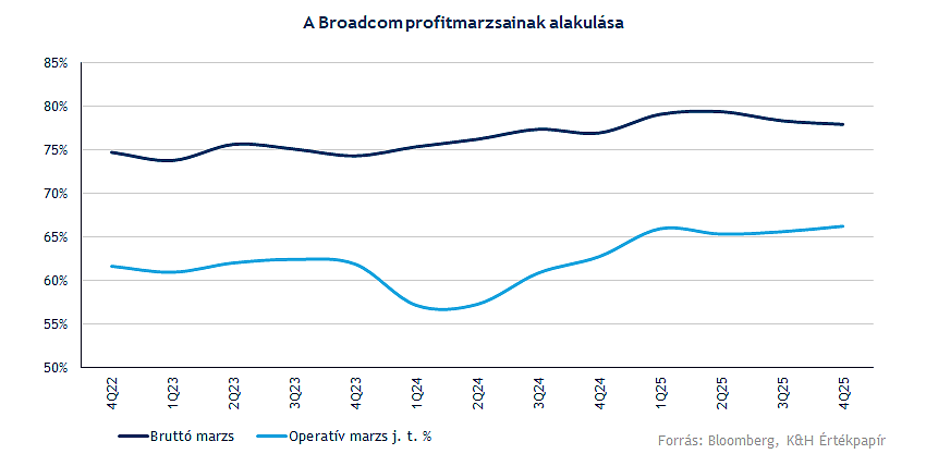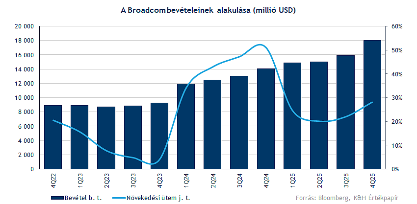 A Broadcom tegnap este közzétette a novemberben zárult, 2025-ös üzleti év negyedik negyedévi eredményeit, amelyek meghaladták a bevételekre és nyereségre vonatkozó előzetes várakozásokat. A bevételek 18,02 milliárd dollárra emelkedtek a konszenzus által becsült 17,49 milliárd dollárral szemben, míg korrigált EPS tekintetében 1,95 dollárt ért el a cég a várt 1,86 dolláros eredménnyel szemben. A vállalat egyúttal közzétette a jövő év novemberéig tartó 2026-os üzleti év első negyedévére vonatkozó előrejelzését, amely szerint a bevételek 19,1 milliárd dollárra emelkedhetnek, ami körülbelül 28 százalékos növekedést jelentene éves szinten, meghaladva a piaci várakozásokat is. Ugyanakkor a részvény a kezdeti pozitív reakciót követően lefelé fordult a piaczárást követő kereskedési időszakban, mivel a piac bizonytalanná vált a jövőbeli növekedés és az AI-szegmens marzsaival kapcsolatban.
