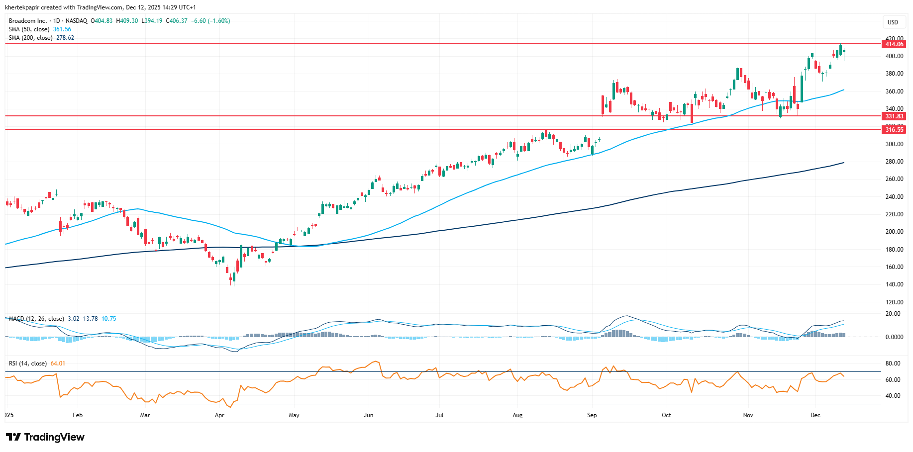 A Broadcom napi grafikonja (2025. 12. 12. nyitás előtt)