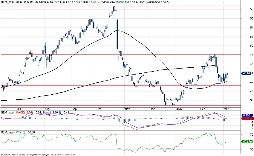 Fontos szintekről próbálna meg a gyengébb piaci környezetben is javítani a Newmont, ebben pedig az arany erősödésének fontos szerepe lehet. Így az 50 napos mozgóátlagról próbált meg új lendületet venni a papír, célba véve a korábbi lokális csúcsokat. A költségek emelkedése némileg rontotta cég profitabilitását, de a portfóliójának tisztításával próbálhat meg visszatérni a javulás útjára a cég.